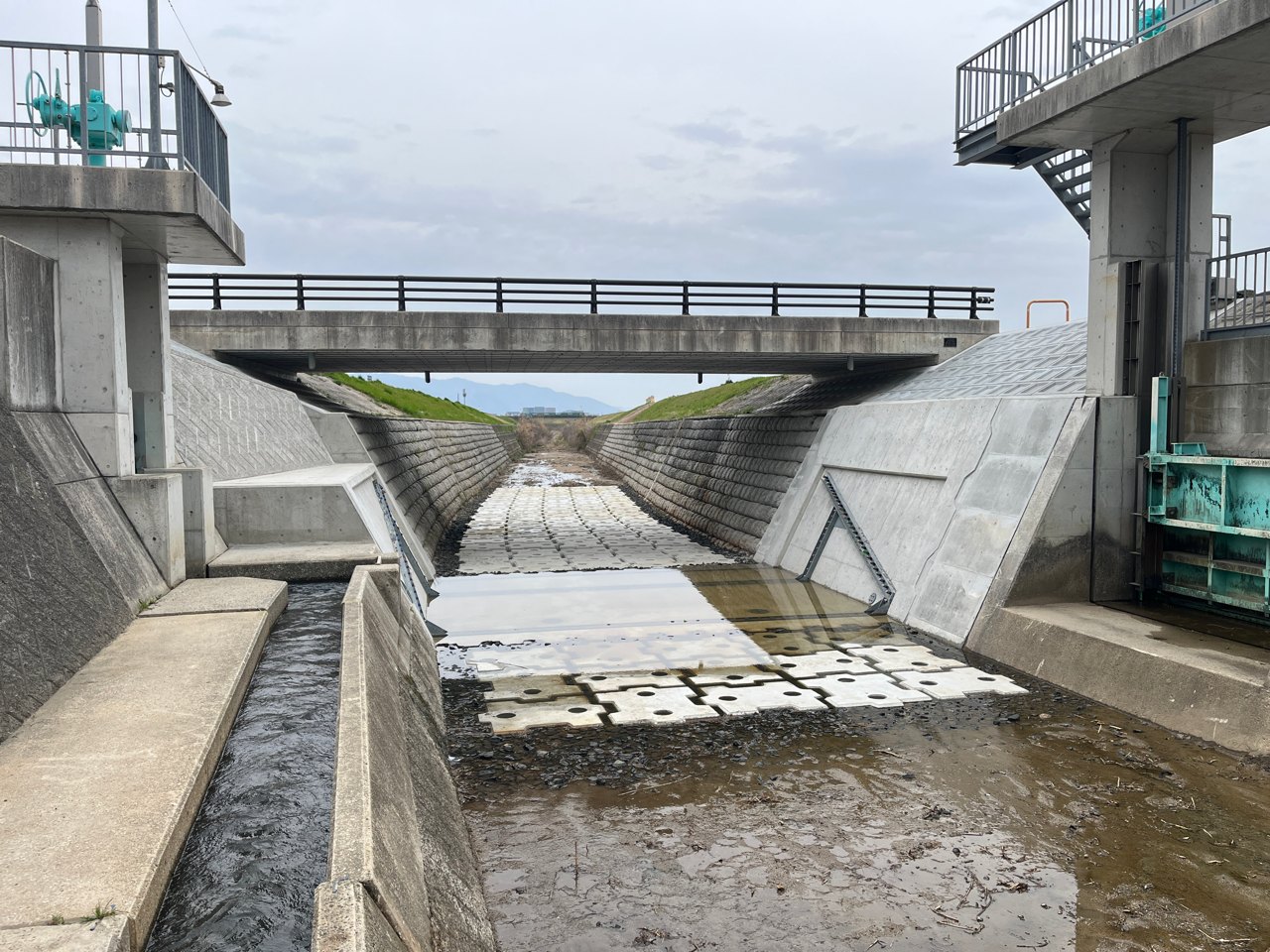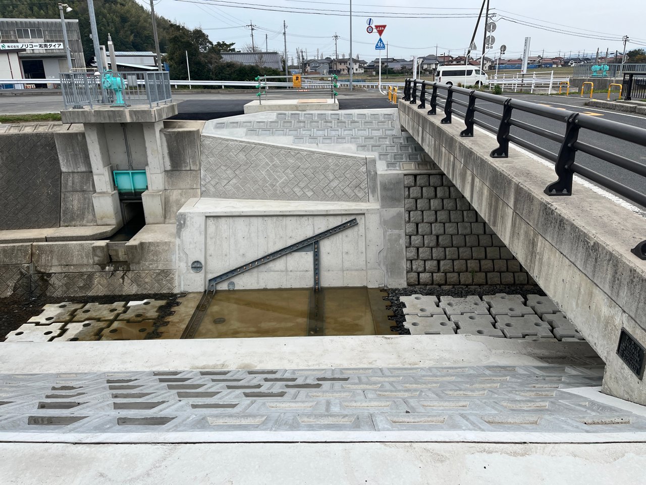 本工事は、既設の水門2基と市道に架かる橋梁との間の狭隘な箇所に堰本体を構築する工事でした。