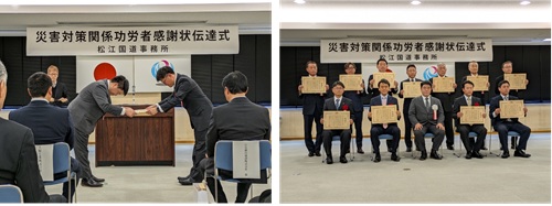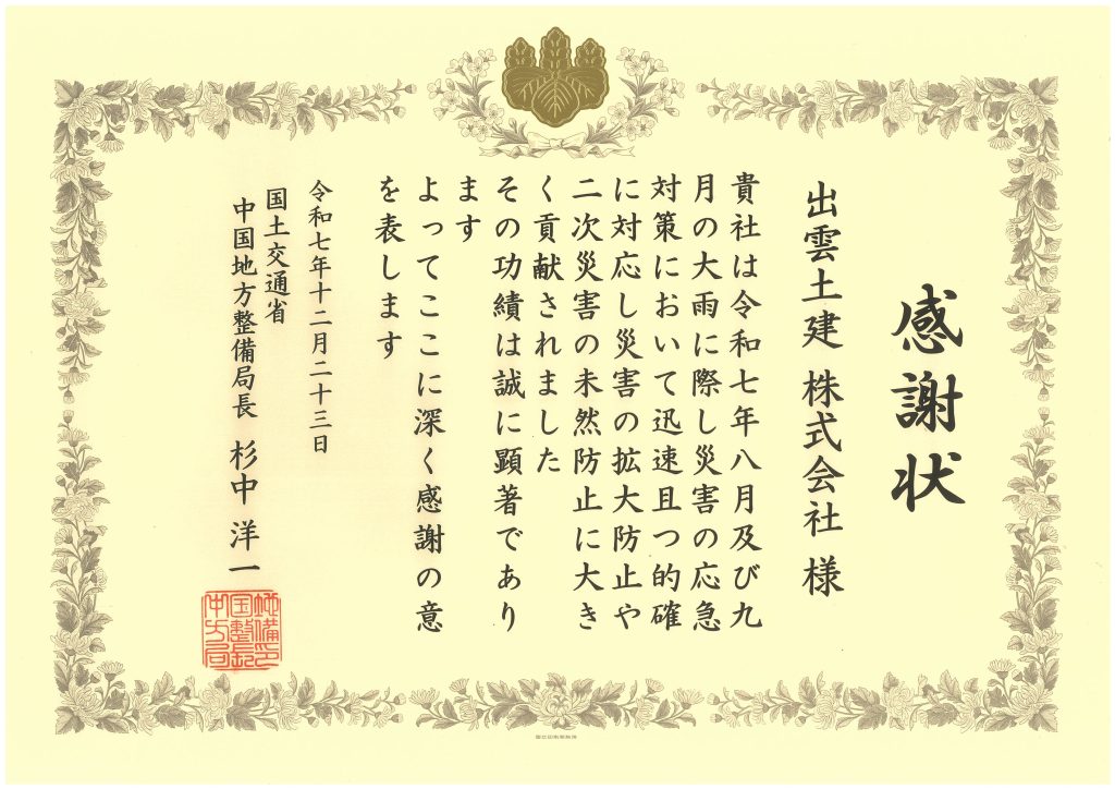 国土交通省中国地方整備局長より、感謝状をいただきました! 2026/01/19 国土交通省中国地方整備局長より、令和7年8月及び9月の大雨の際の応急対策活動について感謝状をいただきました。 これからも地域に貢献できるように、一層努めてまいります。