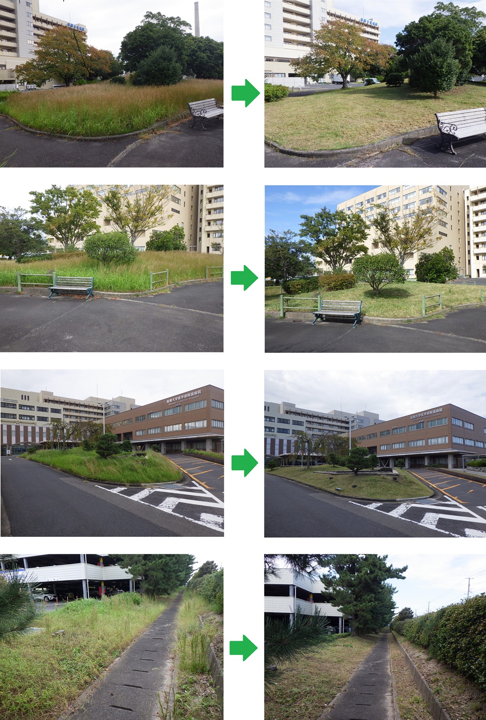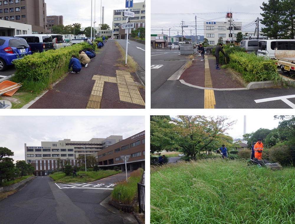 島根大学医学部附属病院の環境整備ボランティアを行いました! 2025/10/20 令和7年10月18日(土)に、島根大学医学部附属病院において環境整備のボランティアを行いました。 地域の皆様に貢献したいとの思いから毎年この活動をしています。 午前8時20分より10時過ぎまで、グループ企業の皆さんと総勢64名で、正面入口と庭園の草刈や草取りの作業を行い、2tトラックに10台分の草木を処分しました。 きれいになった空間で、患者様や、医療従事者様が癒されることを願っています。 作業の様子 きれいになりました!