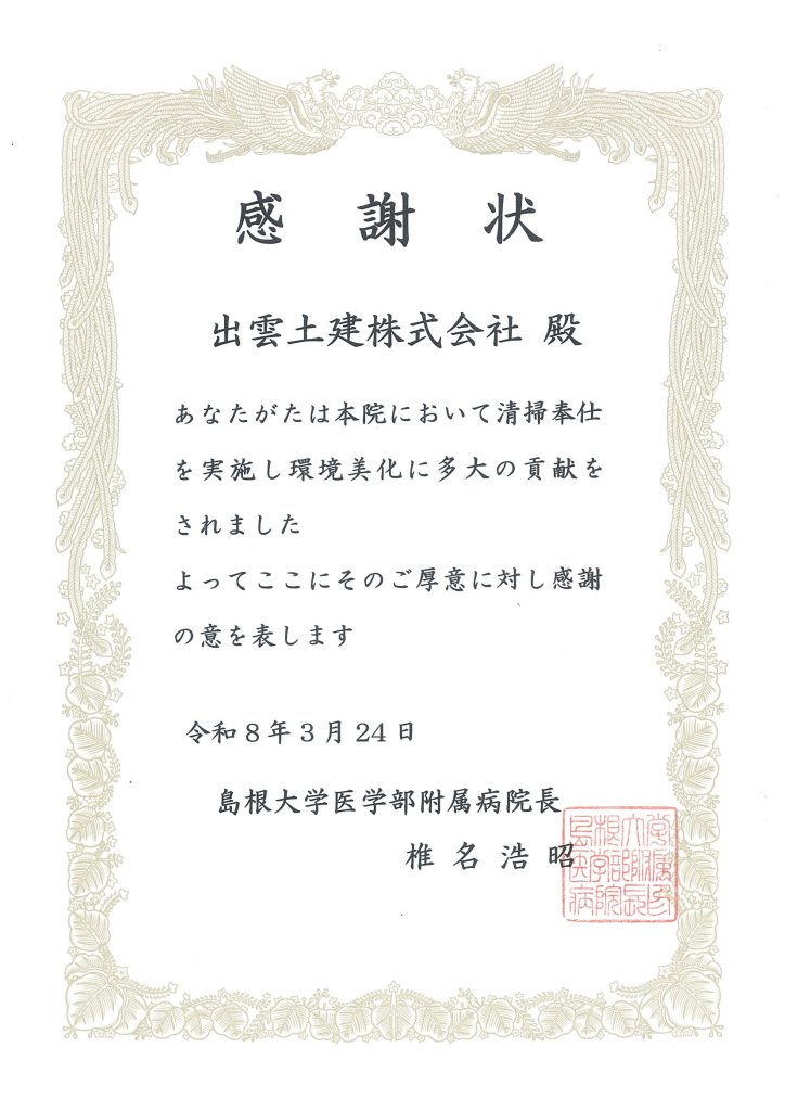 島根大学医学部附属病院より感謝状をいただきました! 2026/03/24 弊社では、地域の皆様に貢献したいとの思いから平成20年(2008年)より島根大学医学部附属病院の環境整備ボランティアをさせていただいております。 この度、この活動に対し椎名浩昭病院長様より感謝状をいただきました。 これからも、患者様や看護されている皆様、医療従事者様が快適に利用できるよう活動を続けていきたいと思います。 誠にありがとうございました。