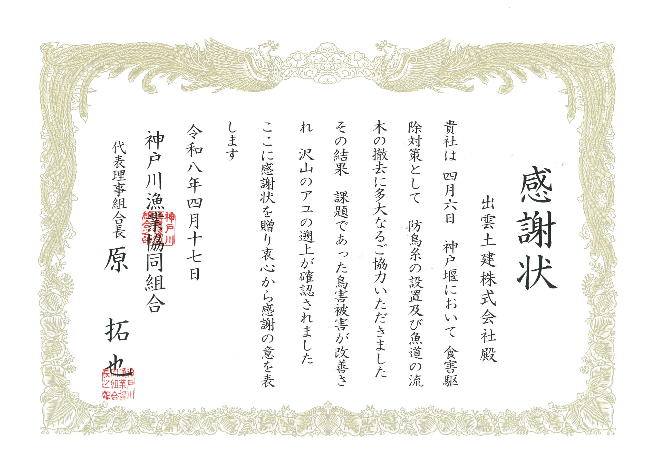 神戸川漁業協同組合より感謝状をいただきました! 2026/04/17 弊社では、神戸川の神戸堰において食害駆除対策として防鳥糸の設置、魚道の流木の撤去を行いました。 その結果、鳥害被害が改善し、たくさんのアユの遡上が確認できたとのことから、神戸川漁業協同組合様より、感謝状をいただきました。 これからも、地域の環境保全と安全・安心なまちづくりに貢献できるよう、関係者の皆様と連携しながら誠実に取り組んでまいります。 誠にありがとうございました。